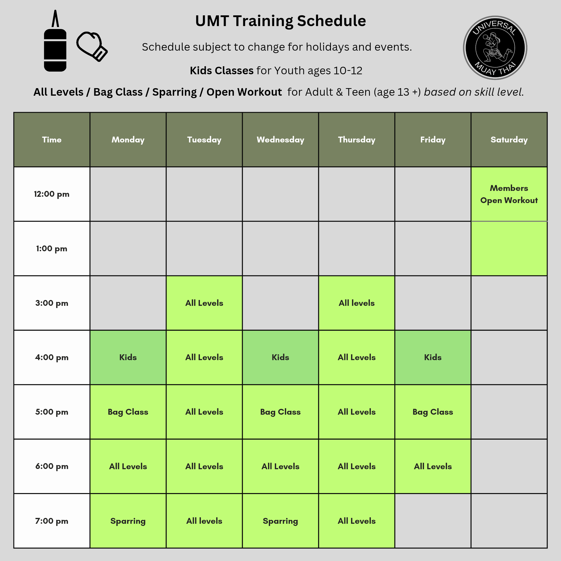 Intro to Muay Thai: New students beginning with the Intro to Muay Thai Program may train in any of the All Levels classes and Bag classes.